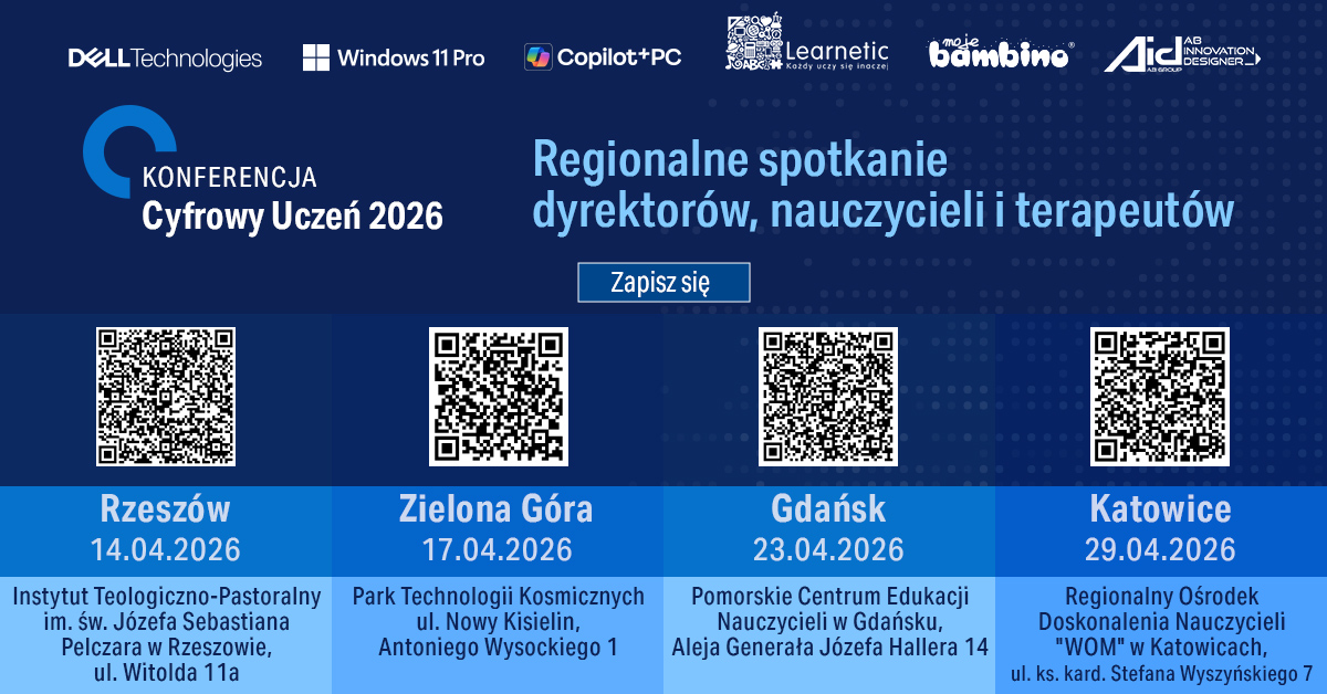 Wiesz już doskonale, jakie pomoce wybrać oraz jak złożyć wniosek, by otrzymać dofinansowanie? Żeby pomóc Ci podjąć właściwą decyzję, zapraszamy na wyjątkowy cykl regionalnych konferencji poświęconych programowi Cyfrowy Uczeń. To nie tylko okazja do zdobycia rzetelnej i aktualnej wiedzy na temat zasad dofinansowania, ale przede wszystkim przestrzeń do spotkania i rozmów z innymi dyrektorami placówek edukacyjnych, ekspertami i praktykami.
